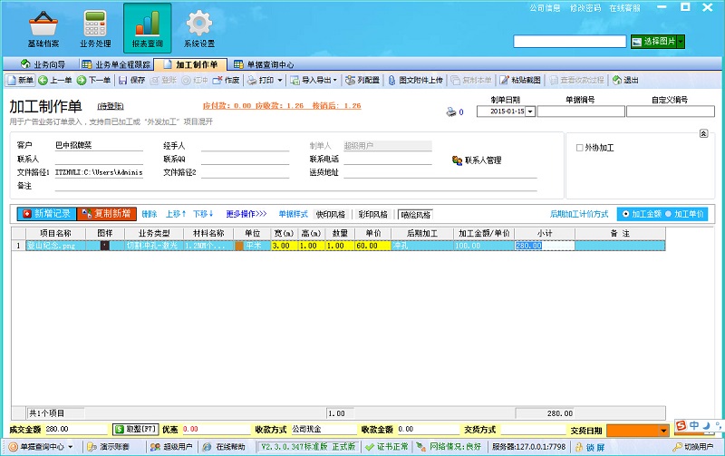 對于農(nóng)先生他們公司需要的開單方式,在飛揚動力廣告公司管理軟件中是很輕松就能完成的,例如他們的客戶把需要制作的圖片發(fā)給他們后,要采用1.2MM厚板進行加工,材料單價是60元/平米,客戶要做1張,寬3M高1M的厚板,后期加工這張板要20個沖孔,一個沖孔的單價是5元/個,那么在軟件中開單就應(yīng)該如下圖所示,前面的材料計價就是寬*高*數(shù)量*單價=180元,而后期加工是按照加工金額來算,就是直接算所有的沖孔的總價格是20*5=100元,總價格就是180+100=280元。