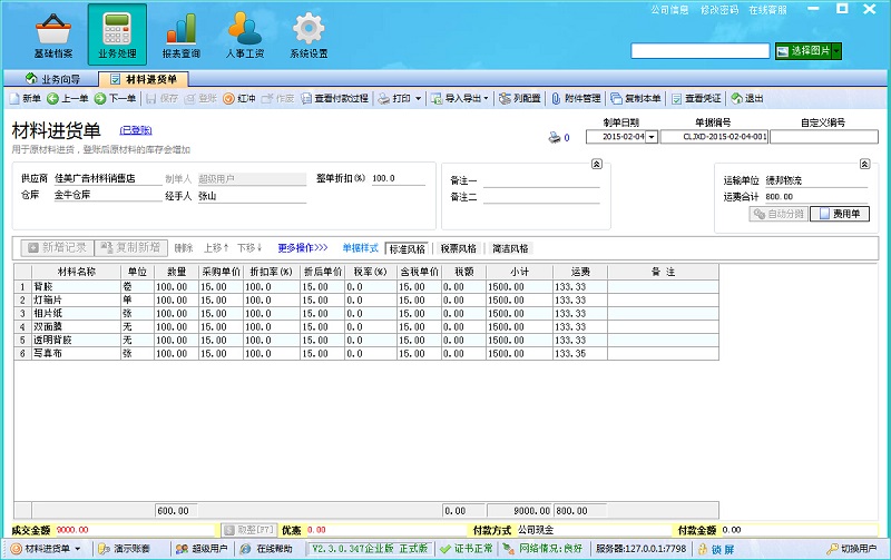 在廣告公司管理系統(tǒng)中,需要用戶對自己公司的倉庫的庫存量進(jìn)行入庫出庫管理,入庫的主要方式當(dāng)然就是通過材料進(jìn)貨入庫,用戶需要開出材料進(jìn)貨單,記錄本次采購的材料是哪一些,采購單價(jià)、采購數(shù)量等信息,以及能夠把本次運(yùn)費(fèi)等費(fèi)用算到成本中去,平攤到每一個(gè)產(chǎn)品的采購單價(jià)中。如下圖所示: